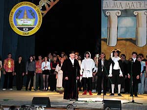 Кого мы посвящаем? Господа студенты, разве так можно?! Это относится именно к первокурсникам, вас что ли не учили элементарным правилам хорошего тона? Я понимаю, что выступление нужно обсудить, но не во время же самого действия и не в полный голос. Даже техника самого ДК не справлялась с этим постоянным гулом в зале, особенно данное обстоятельство действует на нервы, когда стоишь за кулисами или выступаешь. Но вы и сами себя смогли переплюнуть, я просто поражаюсь крепости нервов деканов, которых вы засвистывали (они люди серьезные и это могут не понять, не все же такие, как декан биологического факультета), а на месте ректора я бы просто умер со стыда. Первокурсники умудрились во время его речи в наглую целыми табунами, а это больше никак не назовешь, покидать зал. Это уже не незнание правил этикета, а неуважение к Георгию Ивановичу. Вы думаете, у него возникнет желание еще раз провести такое мероприятие? Будем теперь сидеть в тесноте 2 "Б", и молча "благодарить" вас за медвежью услугу. Вот здесь мое негодование по отношению к старшекурсникам немного поубавилось, они были теми, кто среди первых встал во время исполнения "Gaudeamus'а". Для справки могу сказать, что из-за нас, студентов, церемонию посвящения урезают с каждым годом, если два года назад выступал "Гротеск", год назад - заключительная часть была раза в два длиннее, то в следующем году вообще, скорее всего, обойдутся словами деканов и речью ректора.